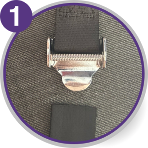 Pasa la correa por debajo del asiento y, a continuación, introdúcela por la ranura superior de la hebilla metálica, tal y como se indica en la imagen. Asegúrate de que no queden nudos ni torceduras.