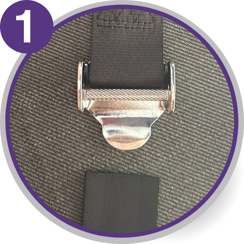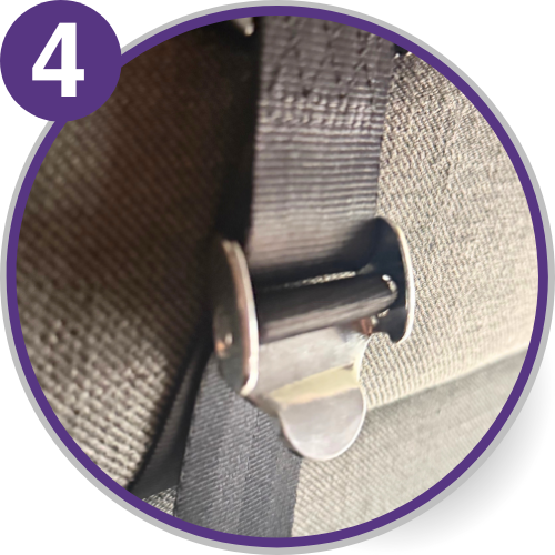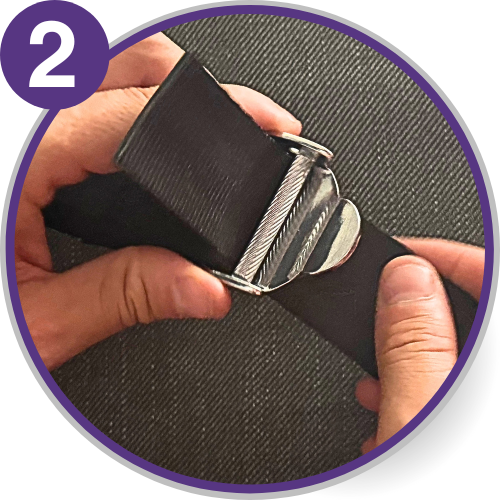 Pasa la correa por debajo del asiento y, a continuación, introdúcela por la ranura superior de la hebilla metálica, tal y como se indica en la imagen. Asegúrate de que no queden nudos ni torceduras.
